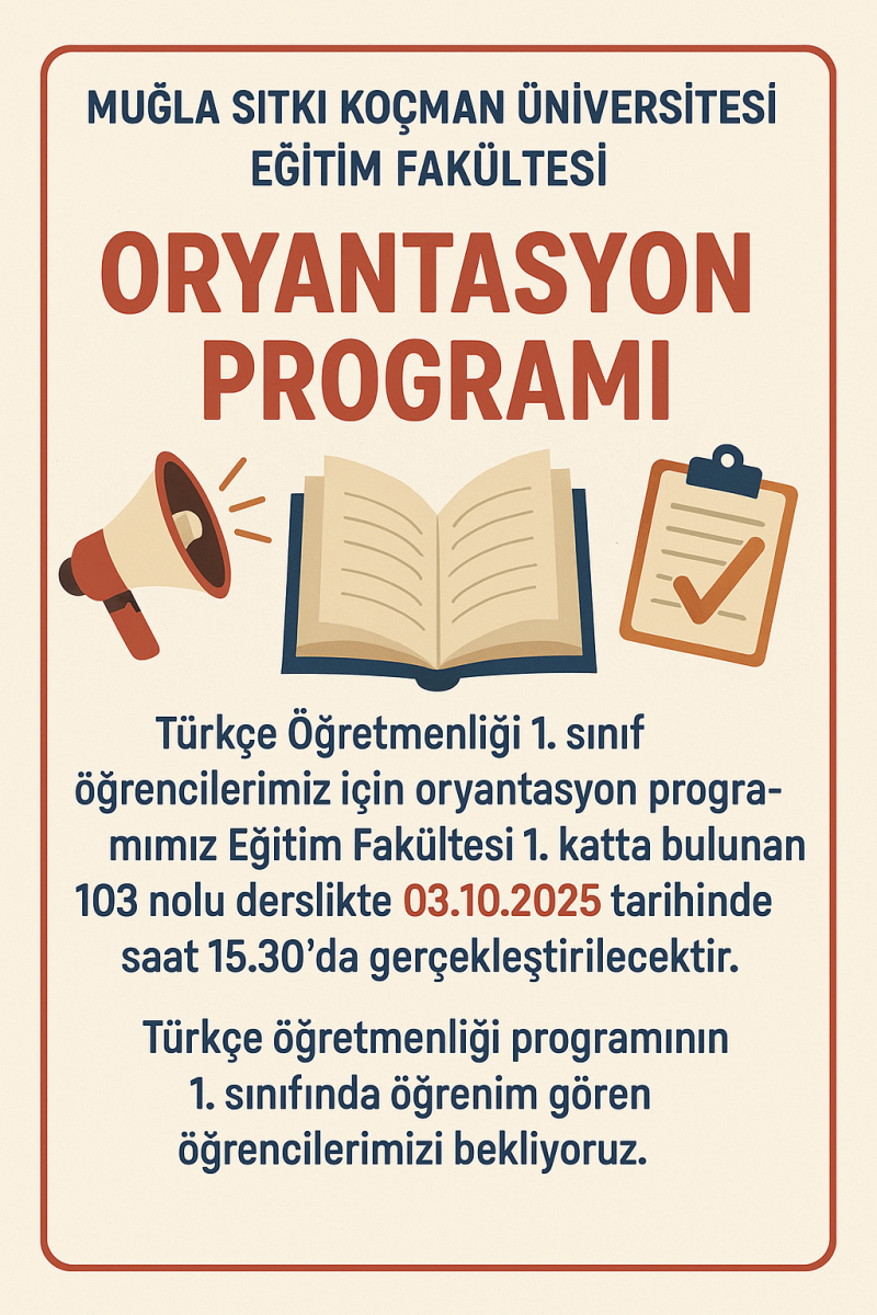 Türkçe Öğretmenliği 1. sınıf öğrencilerine yönelik oryantasyon programı duyurusu Sevgili Türkçe Öğretmenliği 1. sınıf öğrencilerimiz, sizler için hazırlanan oryantasyon programı 03 Ekim 2025’te saat 15.30’da Eğitim Fakültesi 1. katındaki 103 numaralı derslikte yapılacaktır. Hepinizi aramızda görmekten mutluluk duyarız. Son Güncelleme : 07.10.2025 13:00 Okunma Sayısı : 15